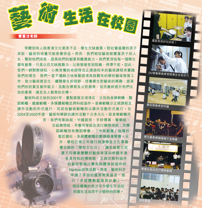 - 運用非正規教育讓學生將藝術溶入生活之中, 從學習及培訓中提升個人素質, 提高創造, 溝通及協作能力及相關學科技能及知識, 通過有系統培訓課程培養堅毅,欣賞及尊重他人, 承擔及關愛精神, 所有課程均免費借用樂器及提供免費培訓讓學生參與。