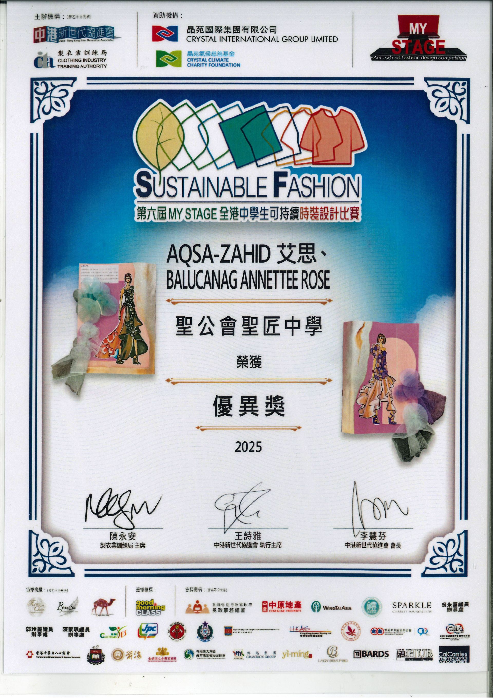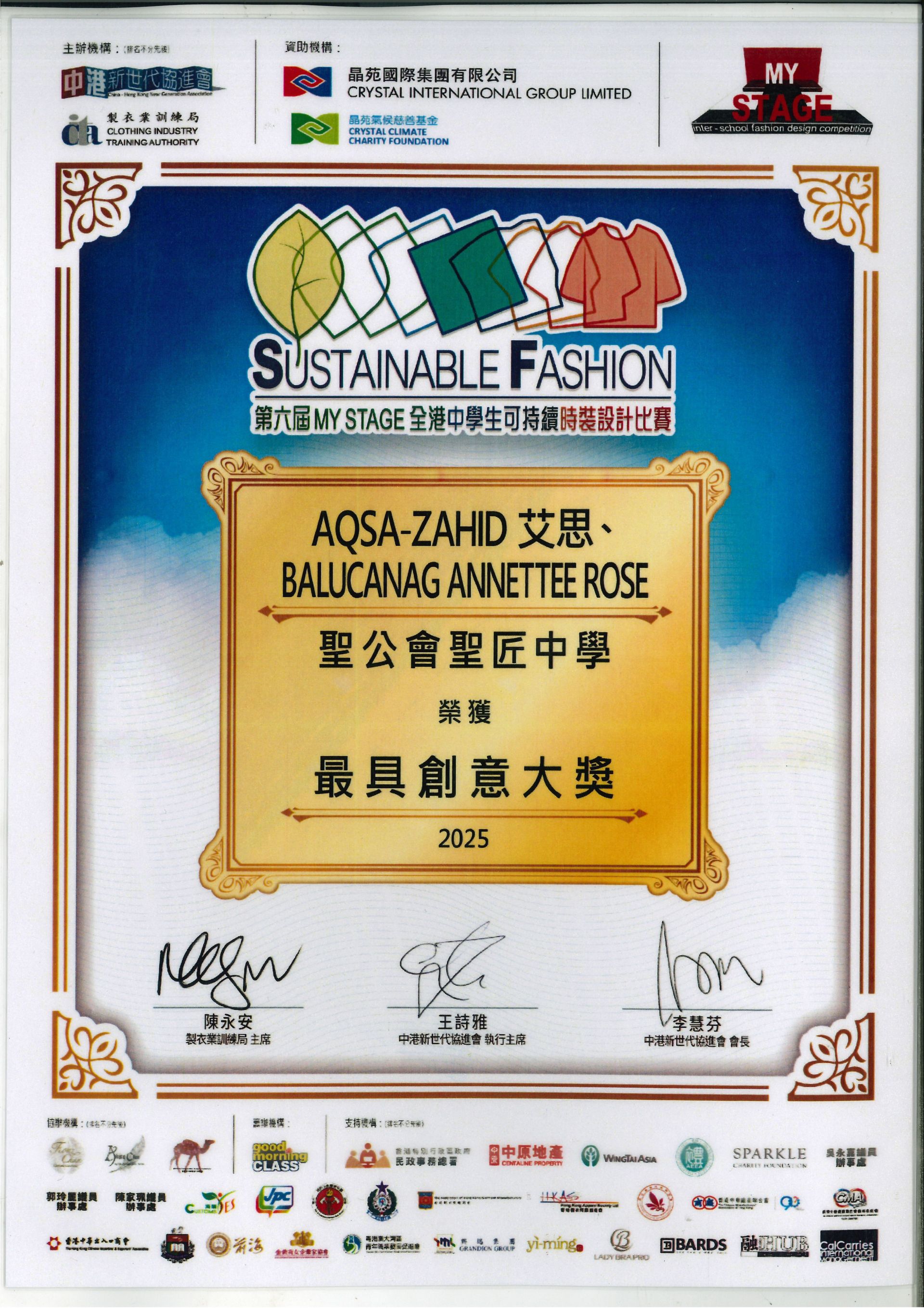第六屆 MY STAGE 全港中學生可持續時裝設計比賽, 本校榮獲最具創意大獎及優異獎。